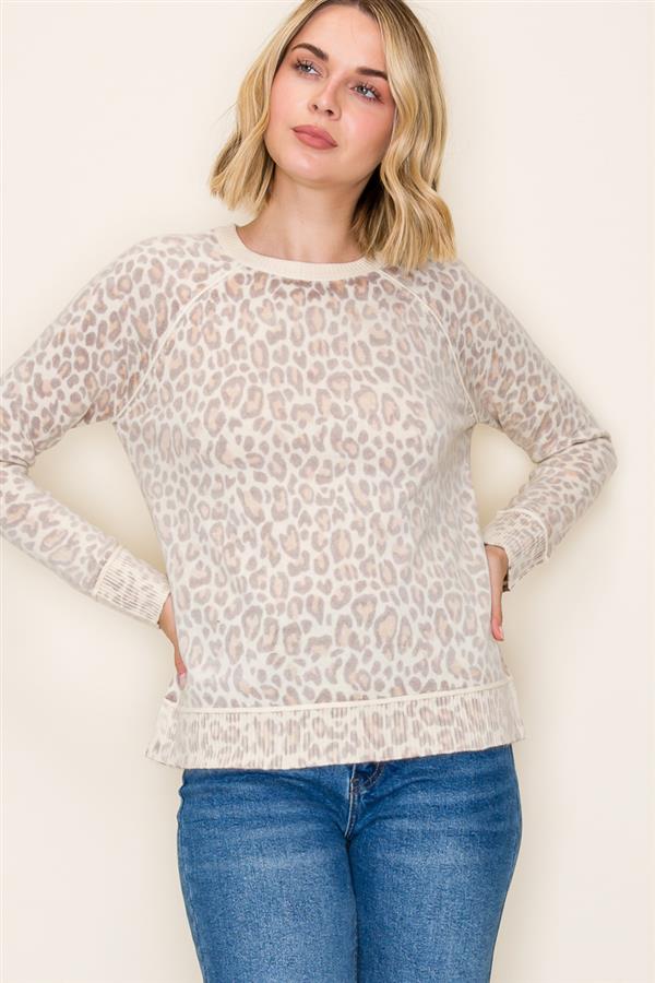 - Camel leopard print sweater with ribbed hem and cuffs. A timeless animal print pullover that adds cozy style to any fall or winter look.