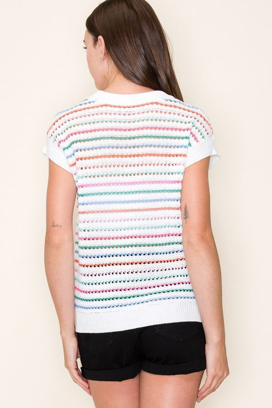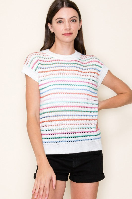 - Brighten up your wardrobe with this multicolor striped knit top featuring short sleeves and an open weave design. Lightweight and fun, it pairs perfectly with denim or high-waisted shorts for a fresh, casual look.