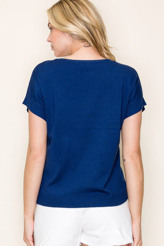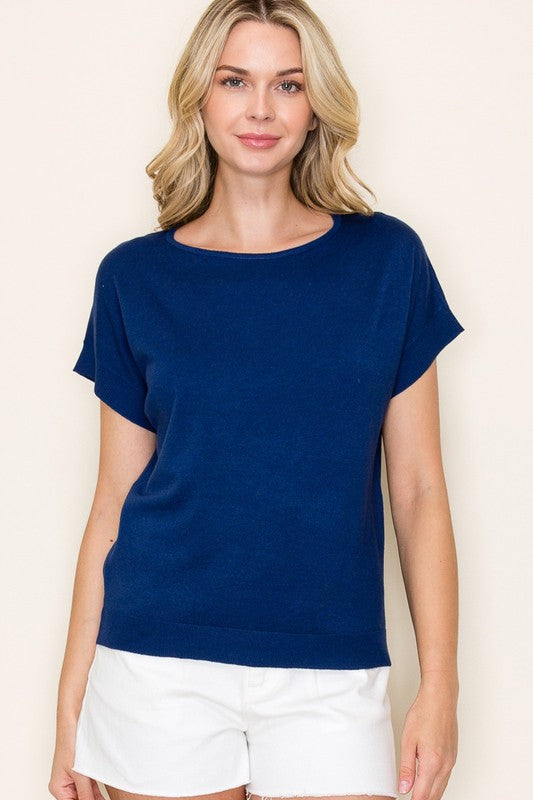 Elevate your everyday wardrobe with this timeless navy short sleeve sweater. Crafted from a lightweight knit, it features a relaxed silhouette, soft texture, and a flattering round neckline. Whether you're headed to brunch, the office, or an evening out, this piece is effortlessly chic and endlessly versatile. Pair it with crisp white shorts, trousers, or layered under a blazer for polished perfection.